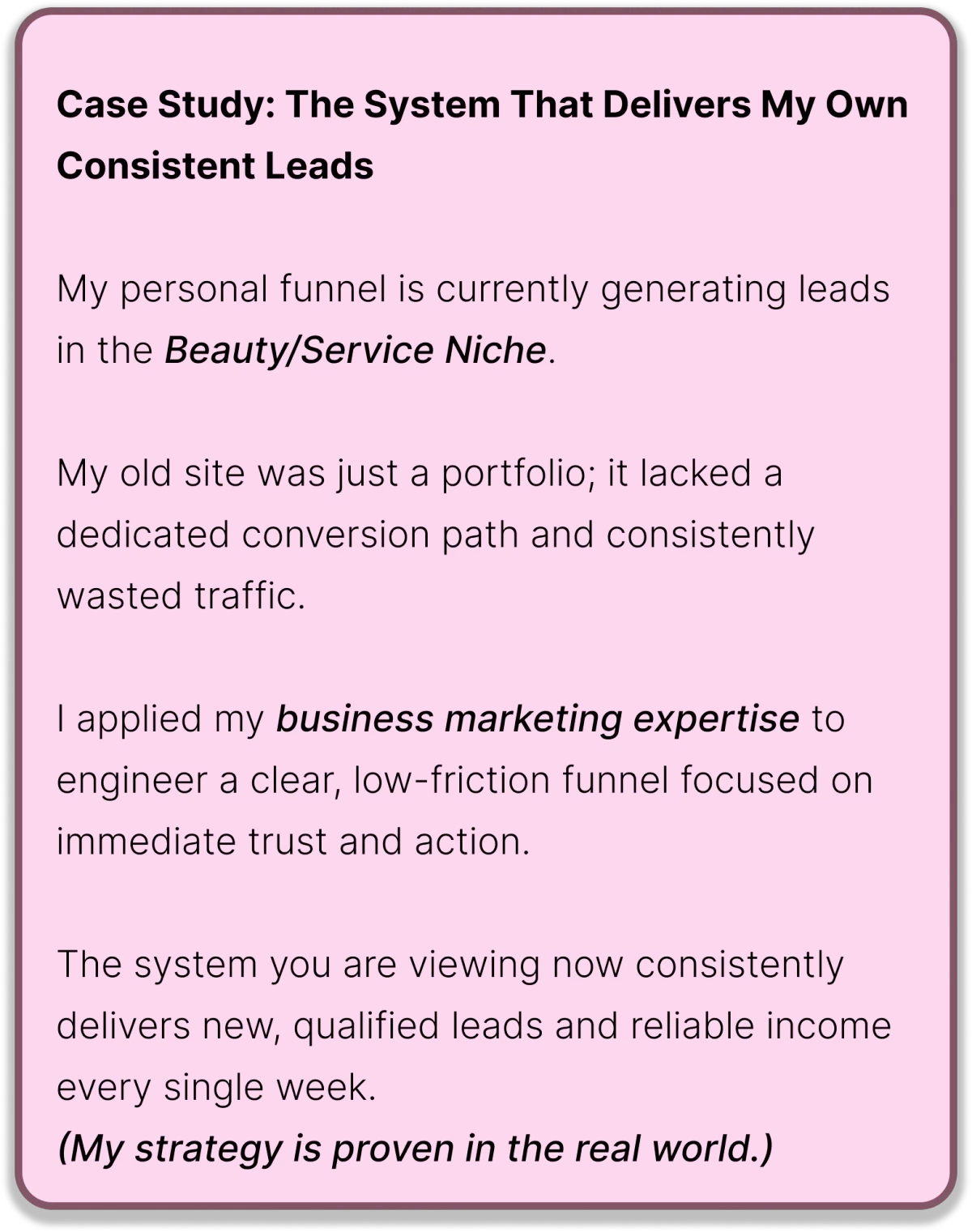 My success is proof that my strategic system works. I focus on universal marketing principles (trust, qualification, urgency), not niche design trends. The principles that generated consistent leads for me are the same ones I adapt for coaches, SaaS, and service businesses worldwide.